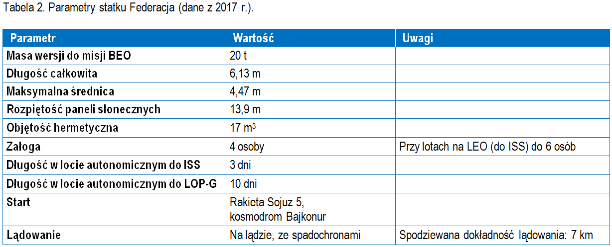 Tabela 2. Parametry statku Federacja (dane z 2017 r.).Obecnie pierwszy bezzałogowy lot Federacji planowany jest w 2022, a załogowy w 2024 r. z wykorzystaniem Sojuza 5. Będą to, jak napisano wcześniej, loty na LEO, najdalej do ISS, zastępując statki Sojuz dowożące tam rosyjskich astronautów i ich klientów. Przewiduje się, że na bazie Sojuza 5 dzięki jego modułowej konstrukcji będą mogły powstać cięższe wersje poprzez zastosowanie w jego pierwszym stopniu kilku głównych modułów. Wersja złożona z pięciu takich modułów o udźwigu 88 t na LEO ma pozwolić ok. 2028 r. na loty w okolice Księżyca, a więc do planowanej już międzynarodowej stacji wokółksiężycowej LOP-G. Prawdziwie super ciężką rakietą według najnowszych informacji prawdopodobnie będzie sześciomodułowa wersja o udźwigu ok. 105 t na LEO, która ma być gotowa ok. 2033 r.