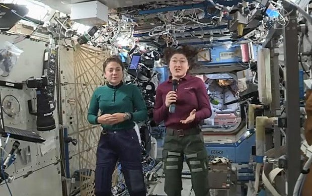 Astronauts Jessica Meir, left, and Christina Koch discuss their work aboard the International Space Station in a space-to-ground interview. Meir and Koch will carry out history's first all-female spacewalk on October 21, the fourth of five planned outings to replace aging batteries in the lab's solar power system. NASA TV
