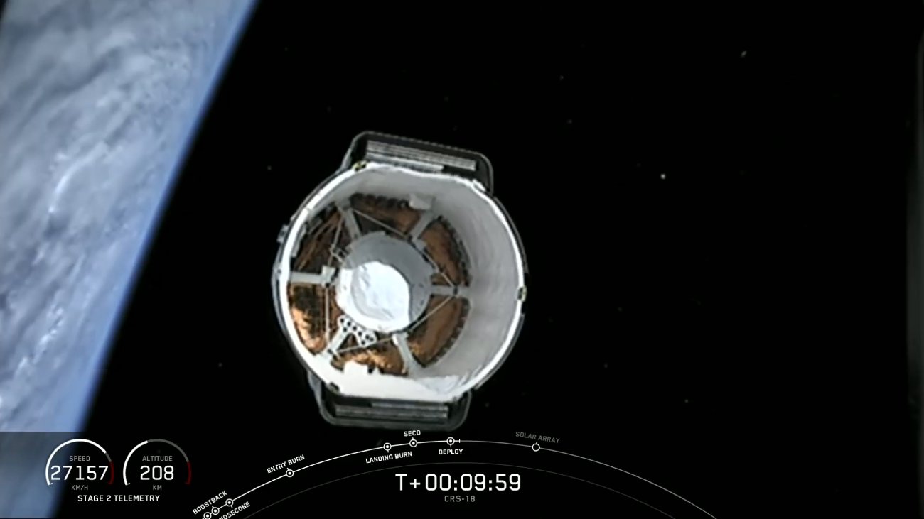 Falcon 9 landing at Cape Canaveral AFS, minutes after launching CRS-18 to the ISS for NASA. Photo Credit: Alan Walters / AmericaSpace.com(...) The single Merlin 1D+ Vacuum engine of the second stage now took over, pushing the CRS-18 Dragon into low-Earth orbit. During the course of its long burn, Dragon’s protective nose fairing was jettisoned to expose the berthing mechanism which it will use on Saturday morning to link up with the ISS.