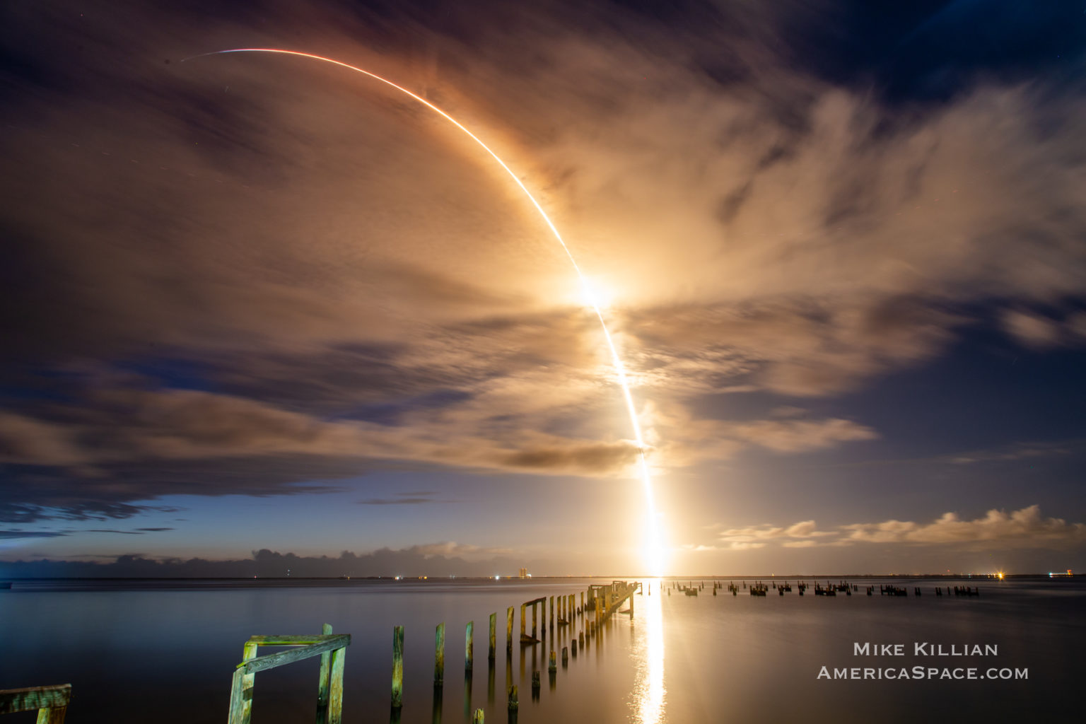 SpaceX launching another batch of Starlinks to orbit from Cape Canaveral pad 40 on June 13, 2020, along with 3 rideshare ‘Skysats’ from Planet Labs. Photo: Mike Killian / AmericaSpace.comSpaceX looks set for another record for its personal-best books this month, having launched a third Falcon 9 in just two weeks to deliver another batch of Starlink internet communications satellites to low-Earth orbit. Liftoff of the previously-flown B1059 core—making its third foray into space, having previously lofted a pair of Dragon cargo missions to the International Space Station (ISS)—took place at 5:21 a.m. EDT Saturday from storied Space Launch Complex (SLC)-40 at Cape Canaveral Air Force Station, Fla.