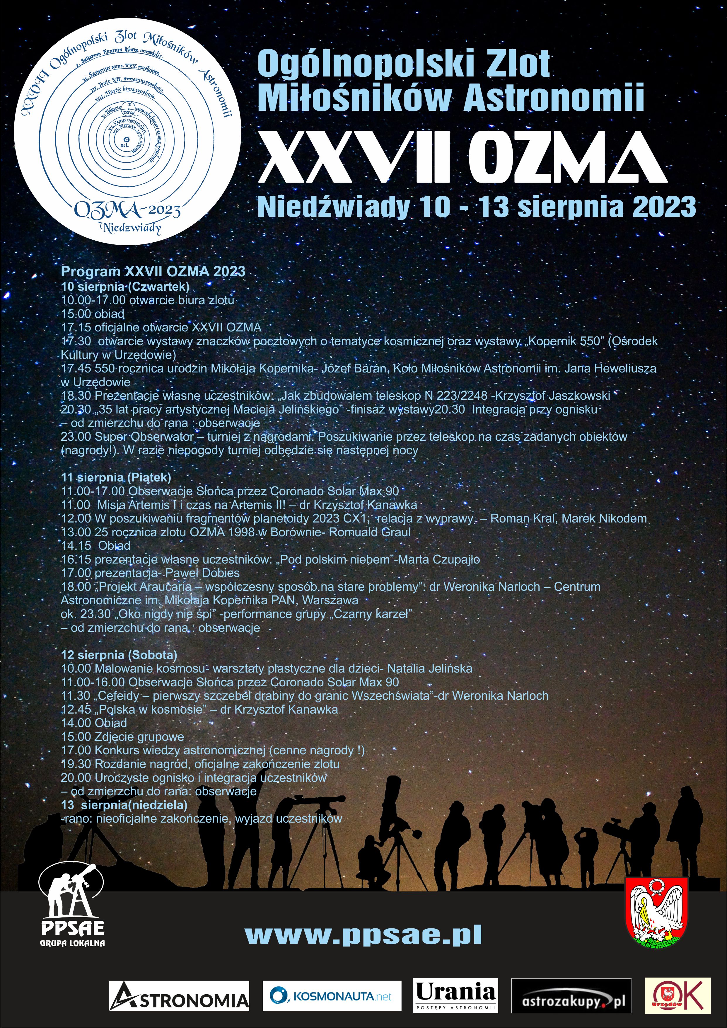 W dniach 10-13 sierpnia (czwartek-niedziela) 2023 r. w Obserwatorium Astronomicznym w Niedźwiadach k. Szubina, woj. kuj-pom. odbędzie się  XXVII Ogólnopolski Zlot Miłośników Astronomii OZMA 2023.
