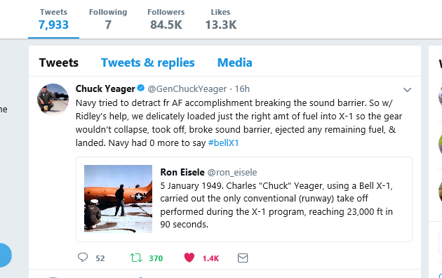 https://twitter.com/ron_eisele/status/173431667483101597612 December 1953. Chuck Yeager’s X1-A tumbled about all three axis as it fell more than 40,000 feet before recovering level flight.