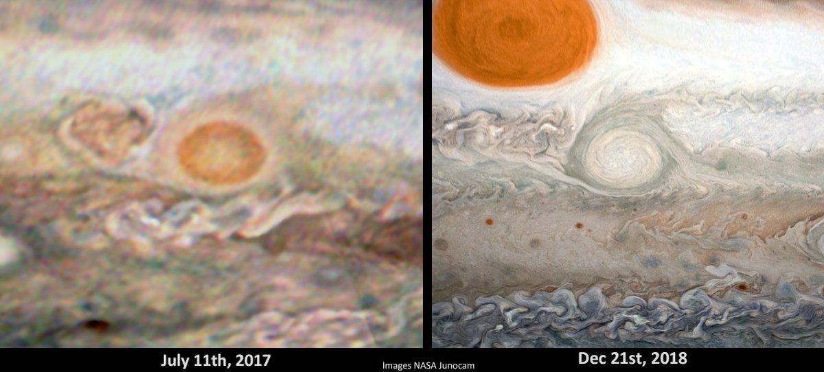 Najsłynniejsza burza na Jowiszu, została sfotografowana z niespotykaną dotąd dokładnością przez sondę badawczą Juno, okazuje się być bogata w gwałtowne procesy atmosferyczne na swoich peryferiach, gdzie wiatry dochodzą do prędkości aż 450 km/h.