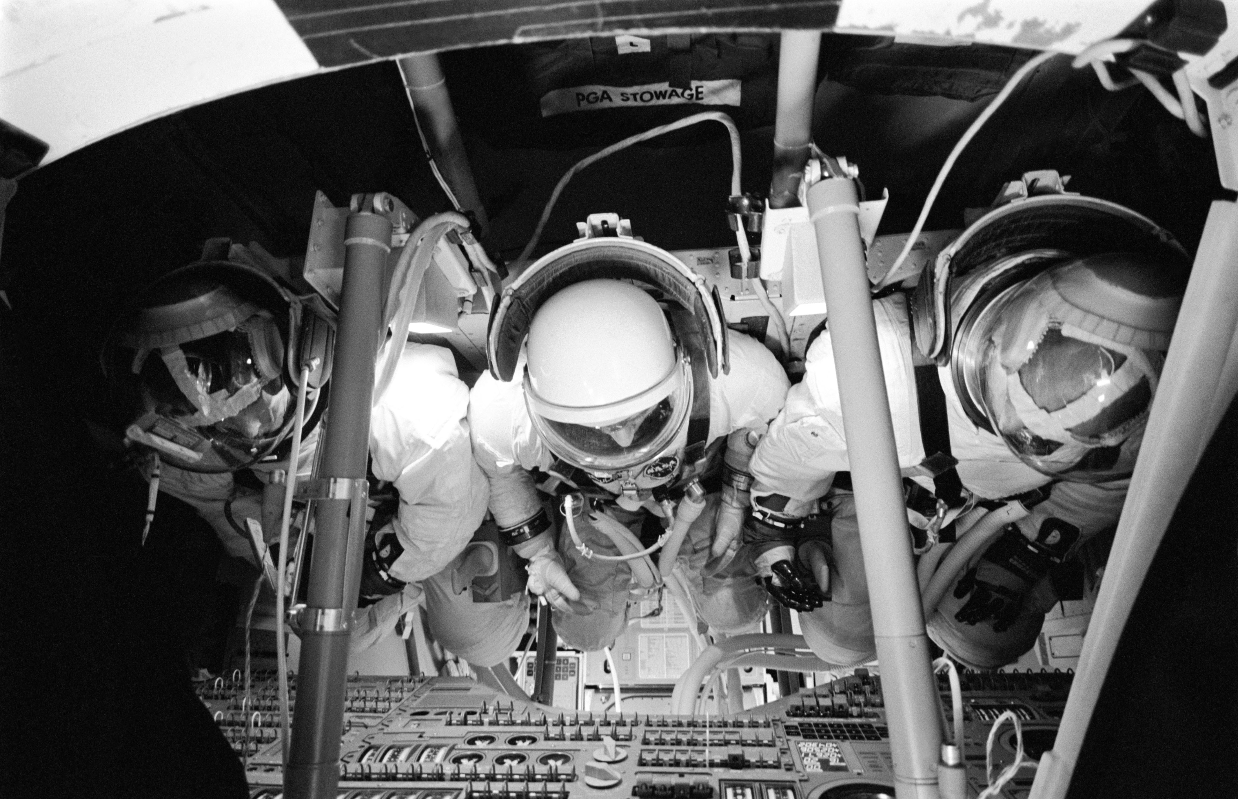 Demonstrating the smallness of the Apollo command module, this training view of the Apollo 10 crew reveals the cramped conditions of their voyage to the Moon. Photo Credit: NASA
