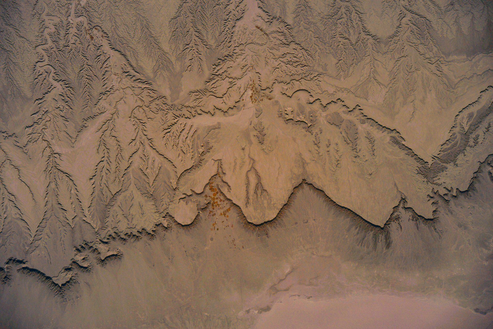 Somewhere over Mongolia. The deserts of Mongolia are striking from orbit. I am awed every time there is an orbit path overhead. This photo is in near infrared where the normal color spectrum is shifted “down” into the infrared region so the colors we are used to seeing are applied to where we cannot perceive.