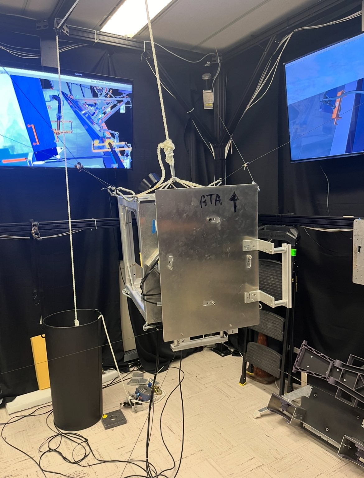 Het is in feite een systeem met katrollen en kleine motoren dat het mogelijk maakt om het hanteren van grote massa's in gewichtloosheid te simuleren. Deze massa's wegen tot enkele honderden kg (op de foto verplaats ik apparatuur van bijna 800 kg 😊!) en hoewel ze niets 'wegen' in gewichtloosheid, kan het verplaatsen van deze massa's een kleine uitdaging zijn.
