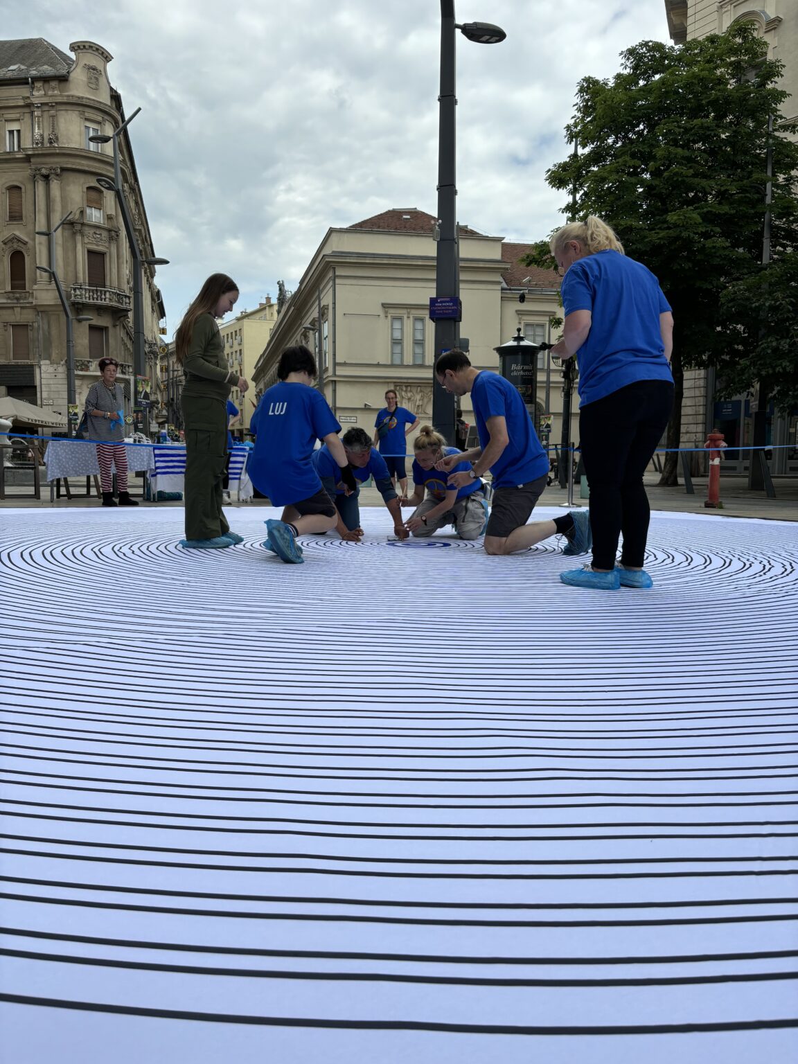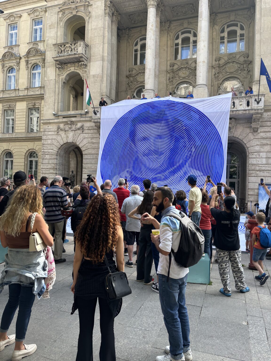 Pozostało tylko zawiesić dzieło na budynku Uniwersytetu ELTE, Wydział Prawa i Administracji.