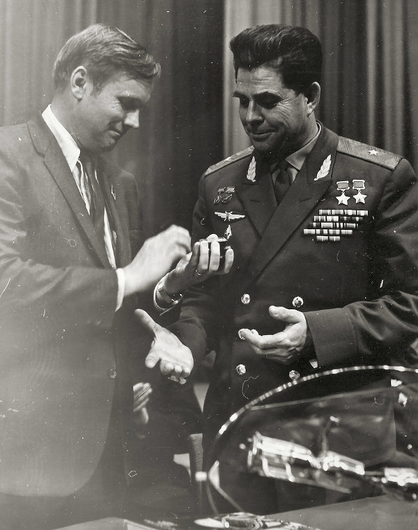 Két legenda egy felvételen – Beregovoj emlékérmet ajándékoz Neil Armstrongnak az 1970 nyarán Leningrádban megrendezett 13. COSPAR (Committee on Space Research, Nemzetközi Világűrbizottság) tanácskozás ideje alatt (Forrás: Heritage Auctions)