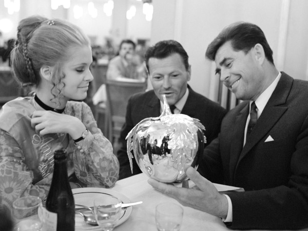 Komjáthy Ágnes és Georgij Ty. Beregovoj az eredményhirdetést követően terített asztal mellett, tolmács közreműködésével beszélgetnek. Az űrhajós kezében a bálkirálynő aranyalmája, a tükröző felületen Beregovoj felesége (ülve) is kivehető. Komjáthy Ágnes nyakában még ott van a 42-es számot viselő herendi porcelán medál. (Forrás: MTI Fotó, Érczi Kovács Gyula)