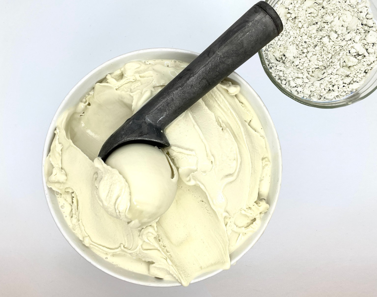 Microalgae in microgravityThis image looks down on a white bowl filled with a creamy, slightly off-white substance and a metal ice cream scoop holding a ball of it. Next to the bowl is a smaller jar containing a coarse white powder.